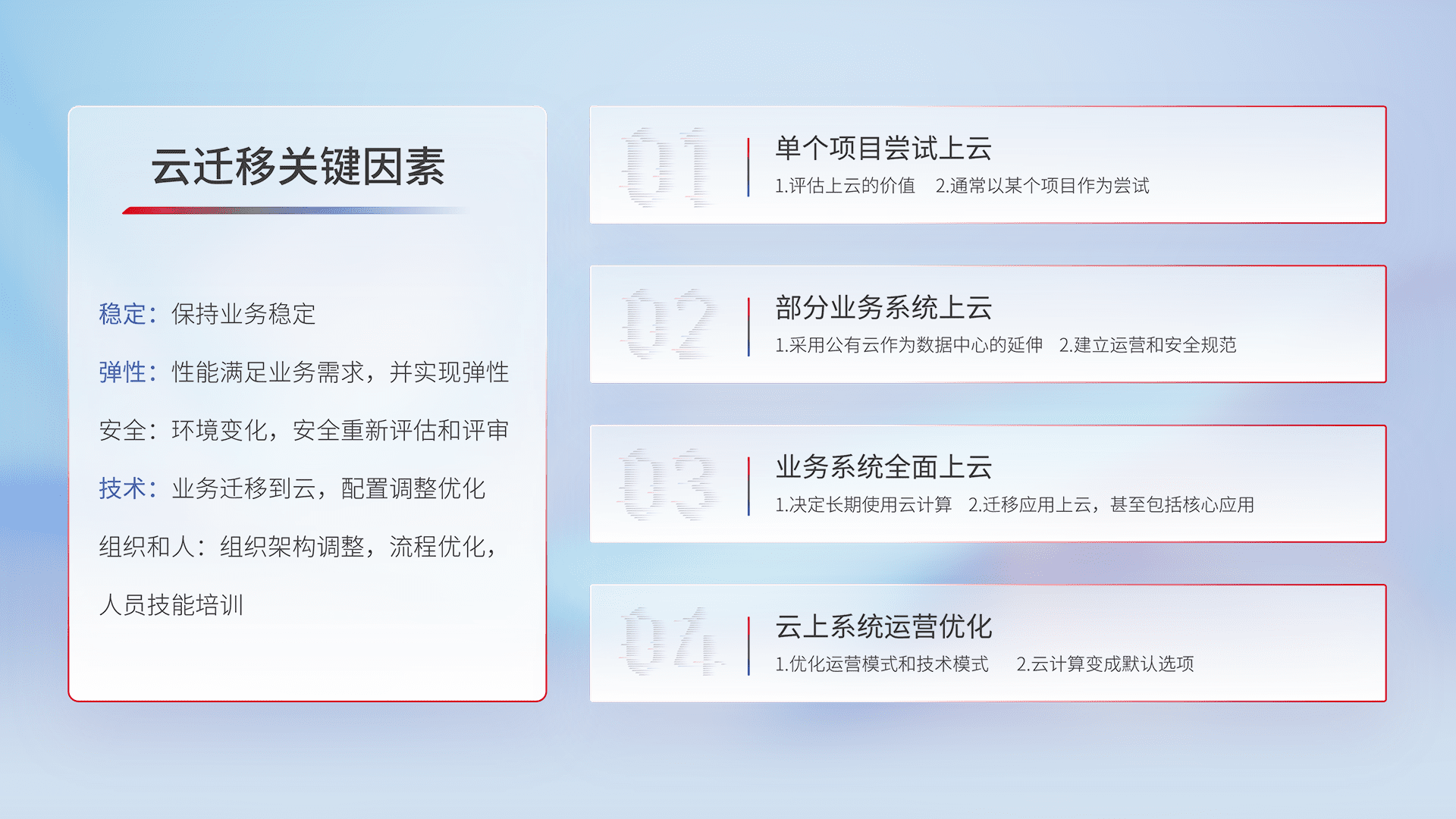 结合实际业务,,,从规划设计、、、、云平台选型、、、、云原生改造、、、数据迁移、、、、集成交付,,,,迁移全过程为客户识别最佳上云路径,,,做好风险识别管理,,设计网络架构、、身份权限、、、安全审计合规、、、、操作审计、、、、日志审计、、、监控告警策略、、、多站点容灾设计等,,对云上基础设施进行整体规划,,提升IT治理水平,,以满足弹性、、、高可用、、、高性能的需求。。