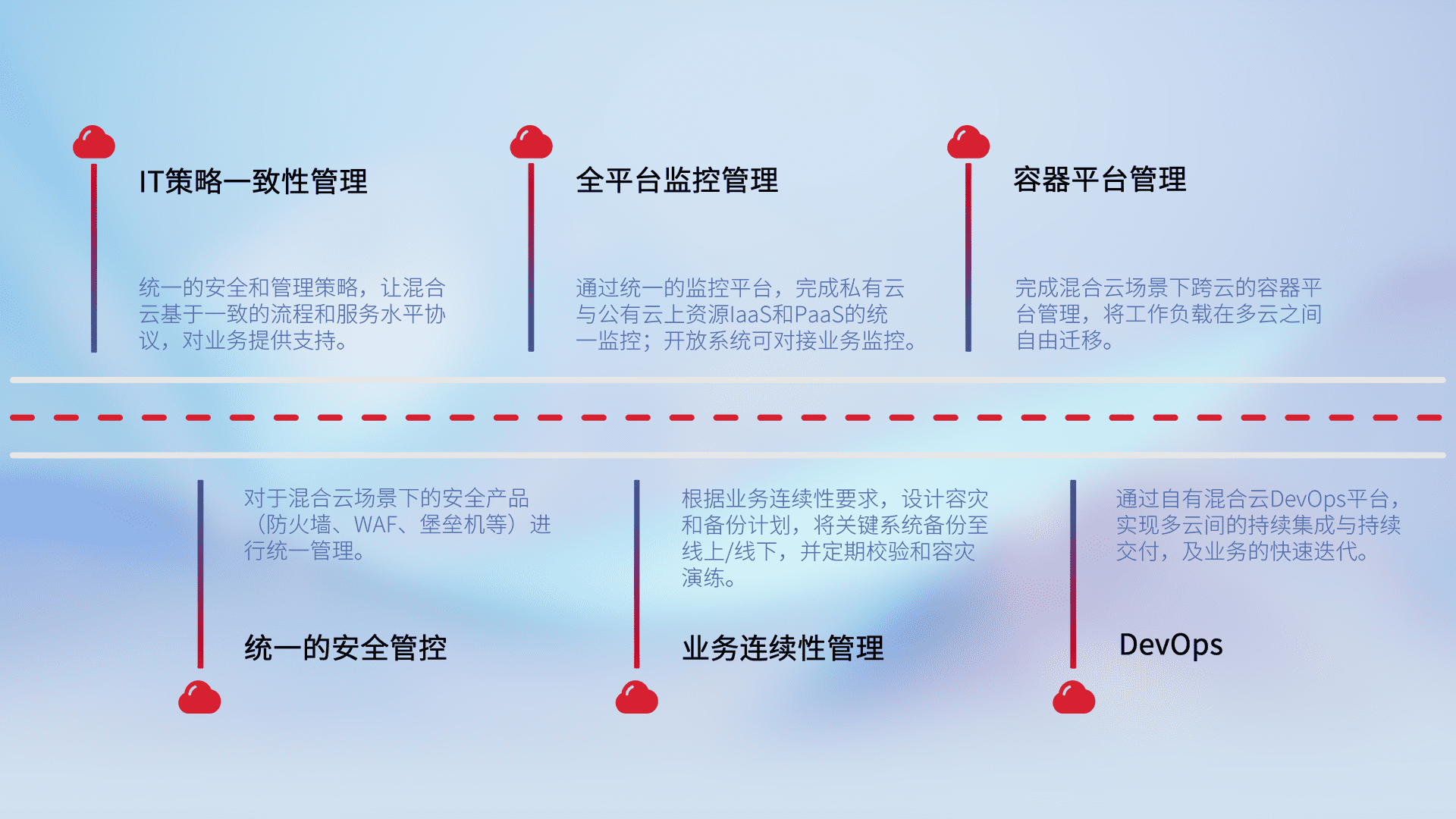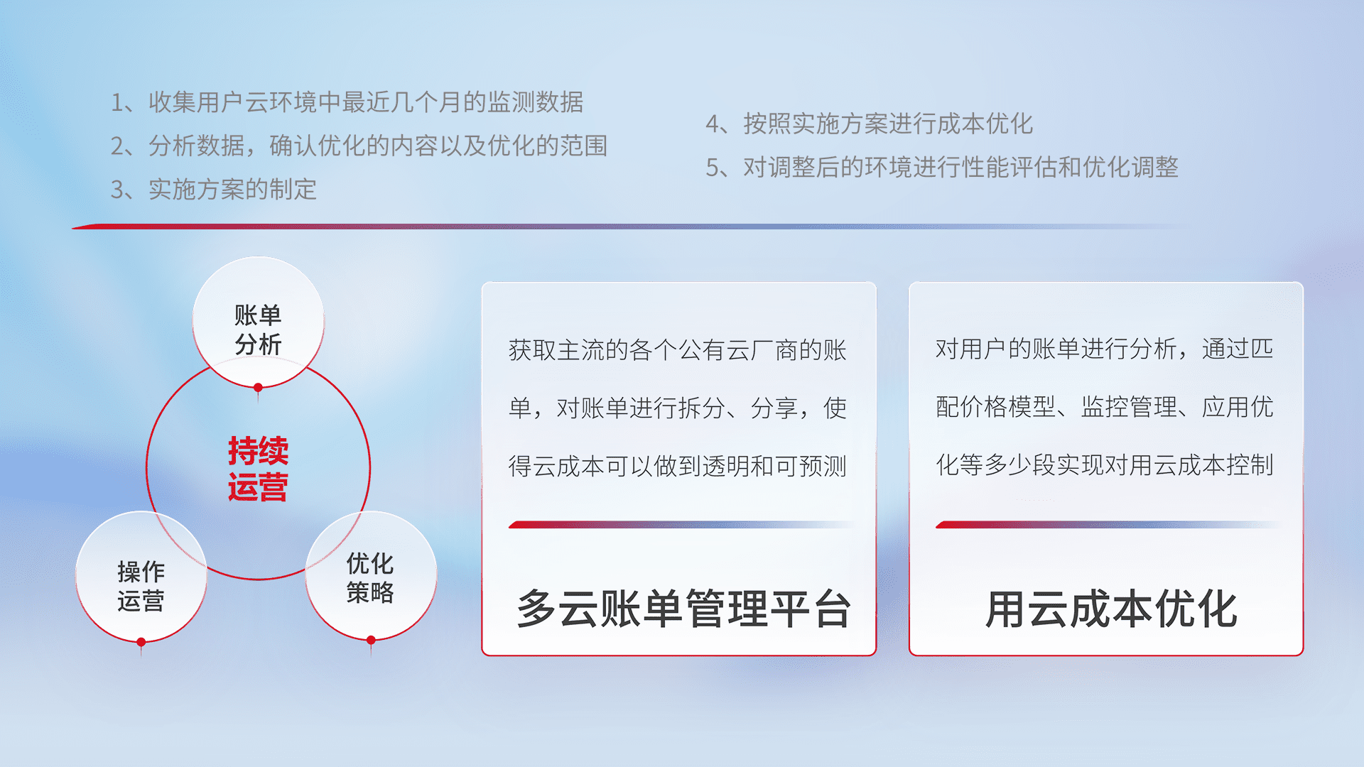 通过多云纳管,,以统一的资源数据模型把客户的云资源进行抽象和封装,,,,进而实现对多云资源的统一操作,,,,保障云资源管理的可靠性、、、稳定性与可用性。。量身定制化运维内容,,,配置、、、、开发运维、、补丁管理、、、、备份、、监控、、、、认证和访问管理、、、审计和日常巡检等,,,保障在用云过程中的可靠度,,稳定度以及高可用率。。。