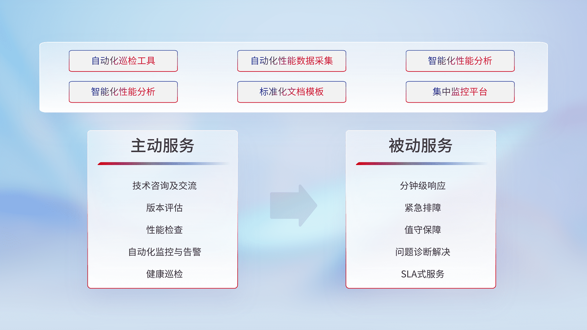 智能化工具和标准化文档,,保障服务质量,,提供主动服务(包含技术咨询、、、版本评估、、性能检查、、自动化监控与告警、、、健康巡检)和被动服务包含(分钟级响应、、、、紧急排障、、值守保障、、、问题诊断解决、、SLA服务)。。