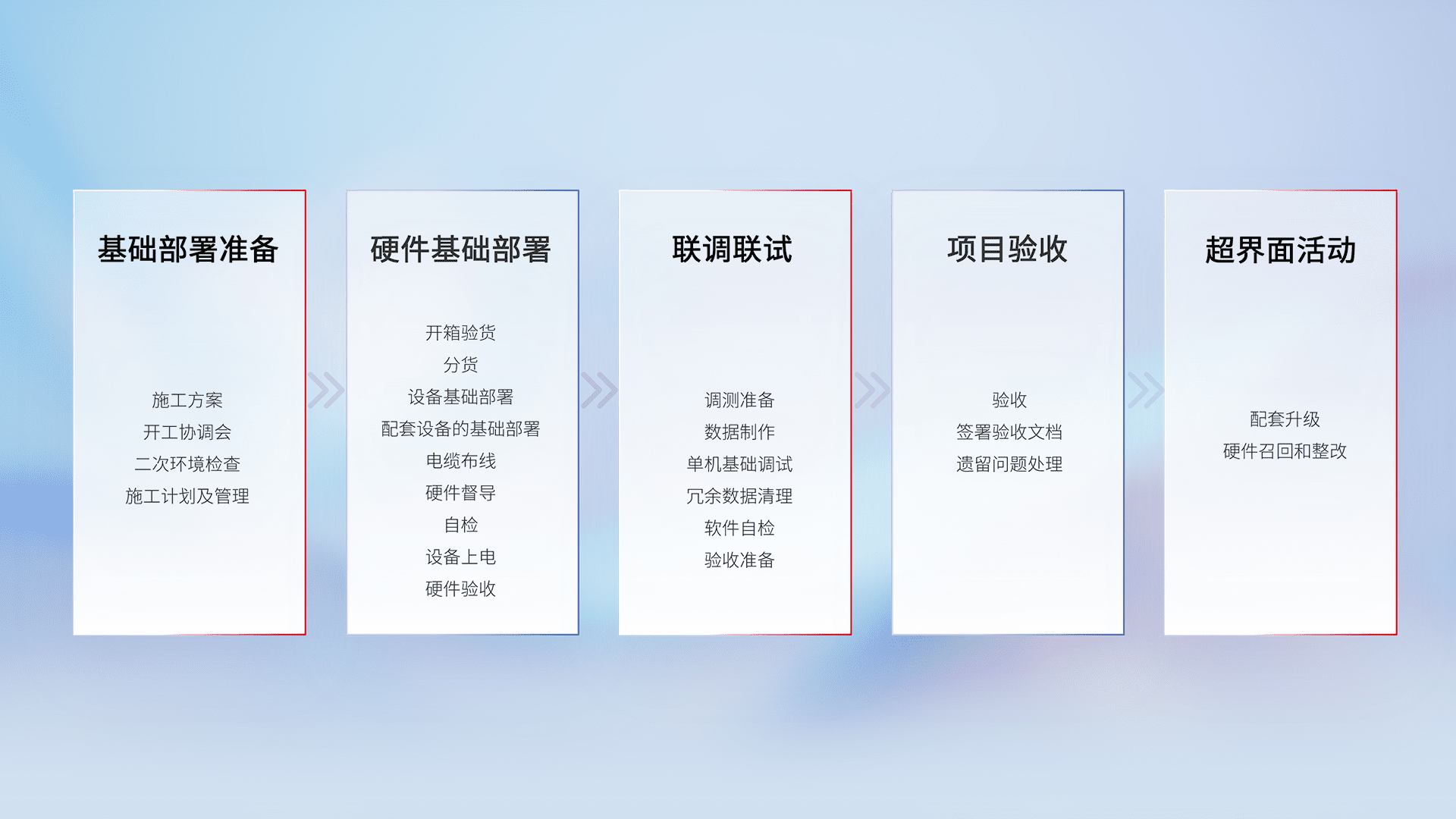 从基础部署准备、、硬件基础部署、、联调联试、、、、项目验收、、、越界面活动的全过程可追溯,,保证施工质量和进度。。。